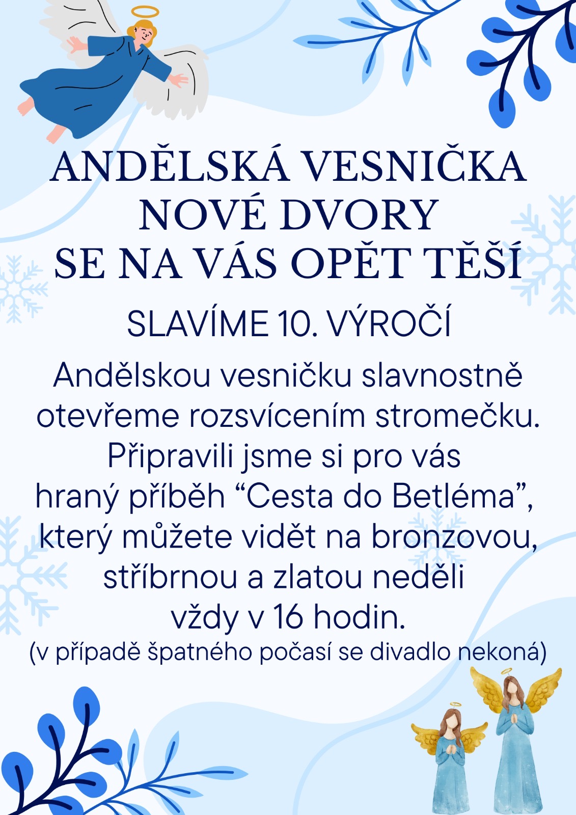 V sobotu 22. listopadu zahájili Novodvorští oslavu 10. výročí vzniku "andělské vesničky" slavnostním rozsvícením vánočního stromečku. Pro návštěvníky vesničky mimo jiné připravili vánoční hraný příběh "Cesta do Betléma", který zahrají na bronzovou, stříbrnou a zlatou neděli vždy od 16.00.